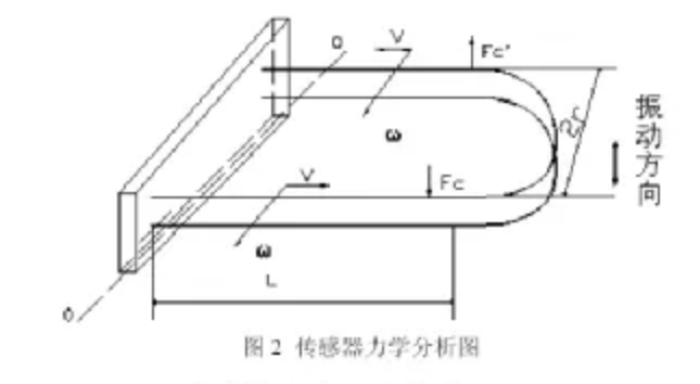 當大拇指代表ω 方向,食指代表V方向,則中指的反方向即為科氏力Fc 的方向。Fc′和的箭頭表示科氏力的方向。當“U”形管被向下驅動時(ω 方向反向),則Fc 和Fc′ 亦反向。通過力學公式推導,可得到測量數值公式表達如下: