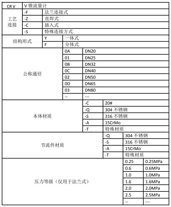 例:CR V-F Y 04 -C -Q 1.6 : V錐流量計,一體式法蘭連接,公稱通徑為DN100,本體材質為20#,節流件材質為304,壓力等級 1.6MPa。