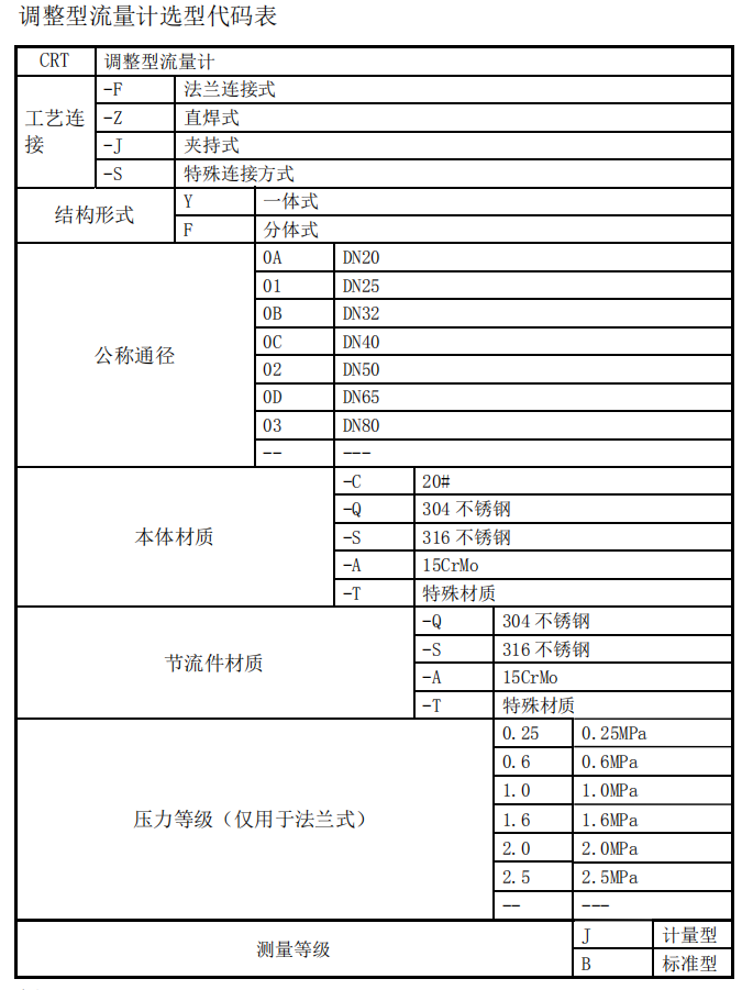 例:CR T -F Y 04-C -Q 1.6 J 調(diào)整型流量計(jì),一體式法蘭連接,公稱通徑為DN100,本體材質(zhì)為 20#,節(jié)流件材質(zhì)為304,壓力等級 1.6MPa,計(jì)量型。以上就是調(diào)整型流量計(jì)的產(chǎn)品介紹。